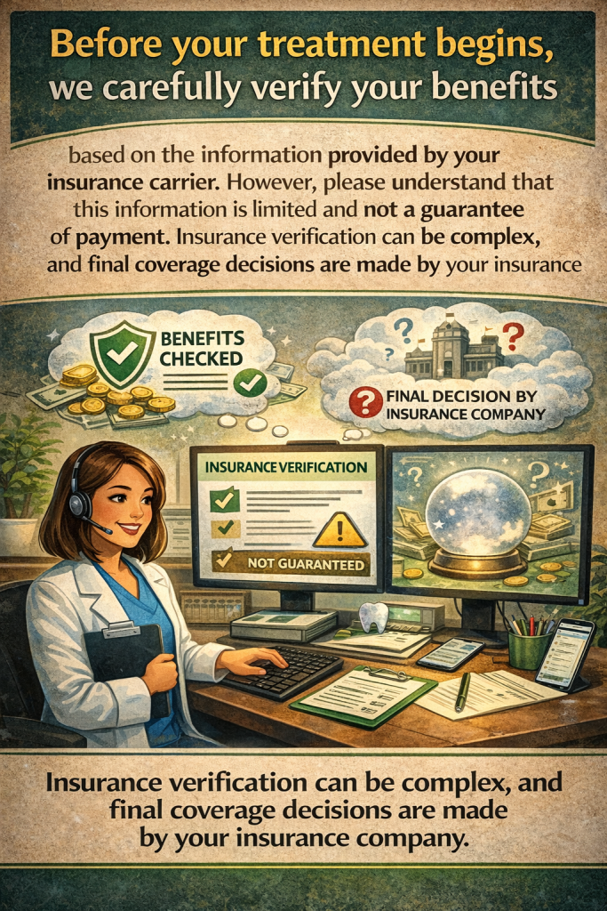 .Before your treatment begins, we thoroughly verify your insurance benefits using the information provided by your insurance carrier. This process includes confirming your coverage details, copayments, deductibles, and any limitations or exclusions related to your plan. However, please understand that this information is preliminary and does not guarantee payment. Insurance policies can be complex, and coverage terms may vary based on the specifics of your plan and the services rendered. Final determination of benefits and payment responsibility is made solely by your insurance company after they review the claim. We recommend contacting your insurance provider directly with any questions about your coverage.
